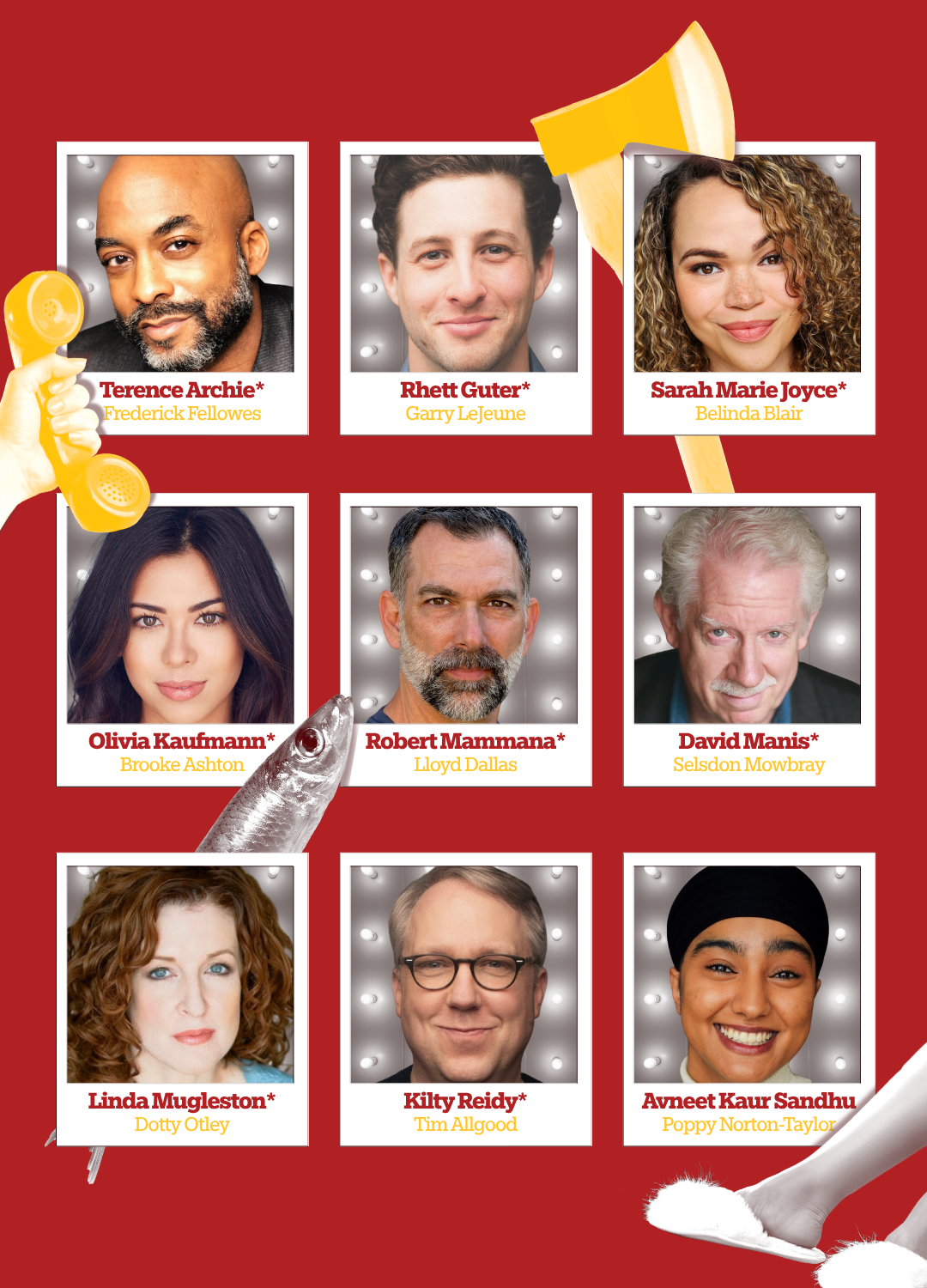The cast features PTC alumni Rhett Guter* (PTC’s White Christmas, Annie National Tour) as Garry LeJeune; Robert Mammana* (PTC’s Prayer for the French Republic, Broadway’s Les Misérables) as Lloyd Dallas; David Manis* (PTC’s Clybourne Park, Broadway’s To Kill a Mockingbird) as Selsdon Mowbray, Linda Mugleston* (PTC’s Souvenir, Broadway’s The Music Man) as Dotty Otley; and Kilty Reidy* (PTC’s The Music Man, Broadway’s The Drowsy Chaperone) as Tim Allgood.